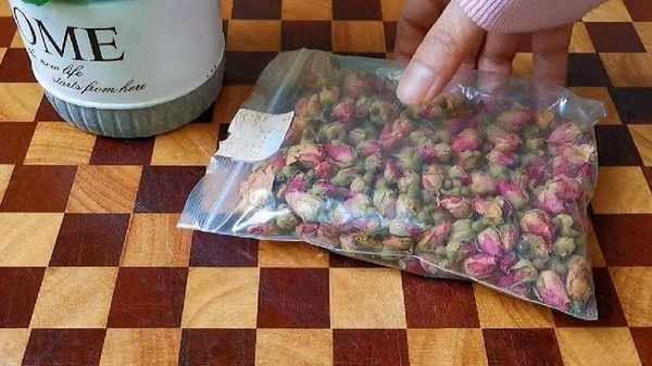 2.再準備一袋玫瑰花幹,把玫瑰花瓣摘下來。