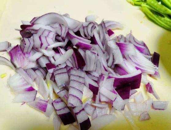 首先把裡脊肉洗凈切成條狀放入碗中,加入適量的淀粉、生抽、料酒,抓勻之後醃制一段時間。洋蔥剝皮清洗幹凈後切成絲,小米椒切成丁。