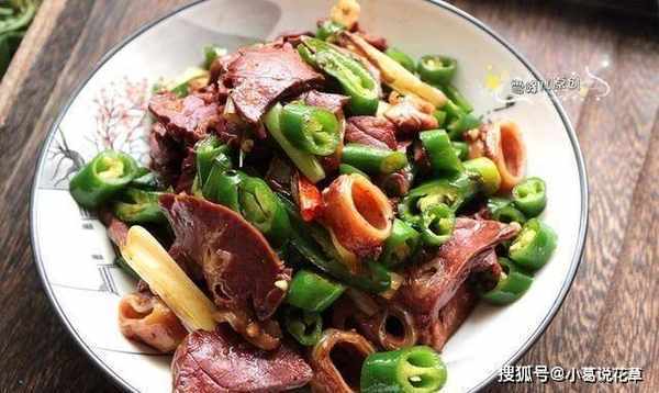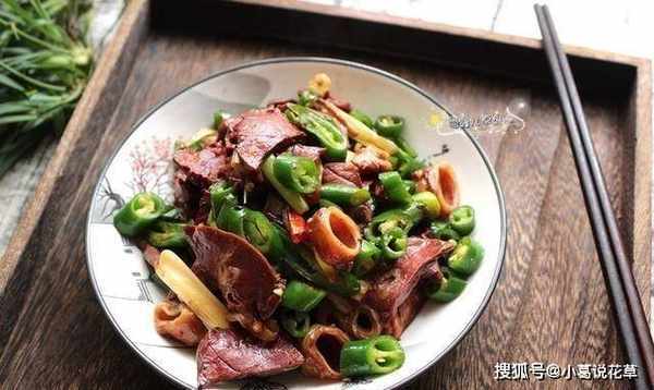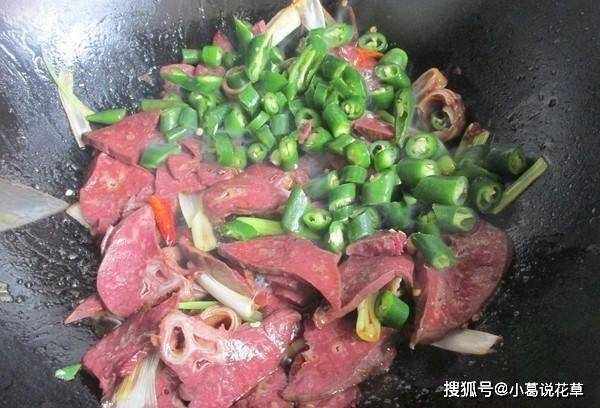 5、加入青辣椒圈邊攪拌邊炒勻。豬肺裡有鹽,不用放鹽