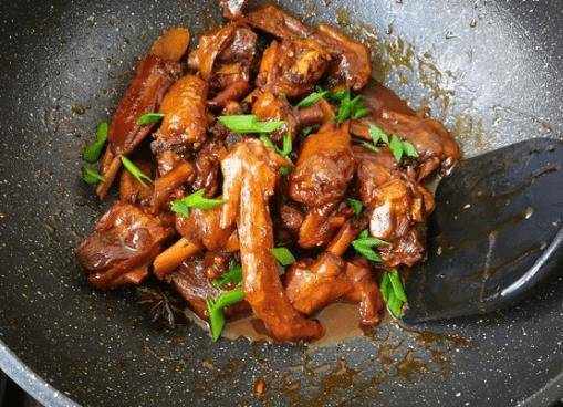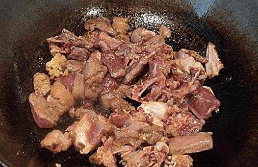 另起一鍋,鍋中倒入少量油,然後將準備好的鴨肉倒入鍋中快速翻炒。把鴨肉的油炸完後,鴨肉會開始微微發黃,這時候就可以把準備好的生薑、桂皮、八角、紅辣椒和月桂葉一起下鍋瞭。