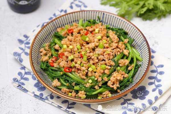 食材:茼蒿1把、肉末適量、紅椒1根、蒜5粒、薑1塊、料酒、生抽、老抽、淀粉、鹽各少許。