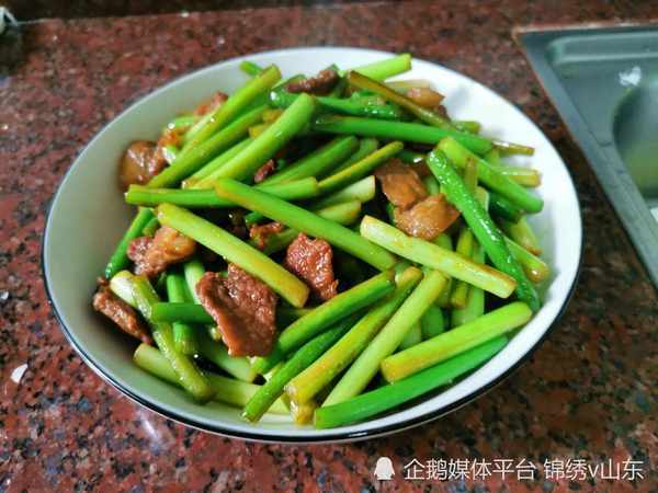 食材:蒜薹一把、瘦肉150克、料酒、生抽、淀粉各1勺,鹽、雞精適量