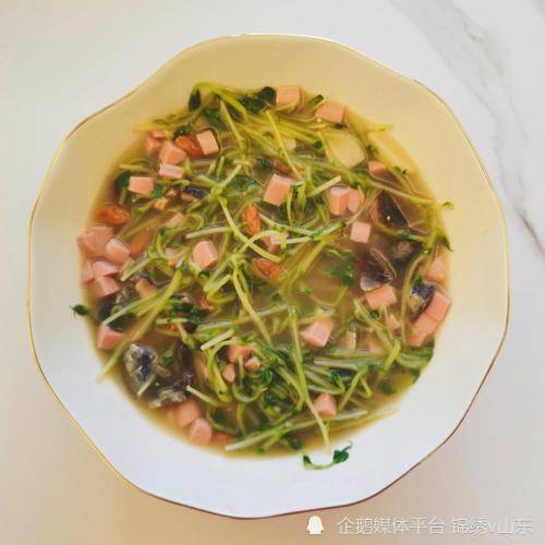 【食材】:豆苗 適量、雞精 少許、咸蛋黃 2個、胡椒粉 少許、鹽 1小勺、皮蛋 1個、蒜末 適量、火腿 適量、