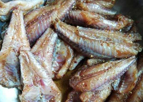 將魚清洗幹凈後,按照殺魚的習慣,將魚打死並敲打頭部。然後去掉鯰魚的殼。這一步有點費力,一般隻有男性才能通過。把垃圾魚的皮去掉後,如下圖把魚肉去掉,就可以開始醃制瞭。