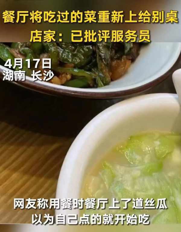 湖南,長沙。一顧客稱在吃飯時店員上瞭一盤絲瓜,過瞭一會店員又說絲瓜上錯瞭要端走,自己告訴店員已經吃過瞭,她還是端給瞭另外一桌客人,這件事曝出後店傢回應:當天太忙瞭,店員是一時疏忽。