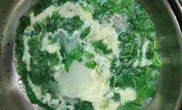 第二步:在火鍋中倒入適量的水,用旺火將水燒開,水燒開後將龍葵放入鍋中。接下來,將2、3個雞蛋打入碗中,加入鹽和雞粉,用筷子順時針方向攪拌,等鍋燒開約5、6分鐘後,將炒好的雞蛋倒入碗中,再次攪拌,大概是等著雞蛋在上盤前先煮熟!