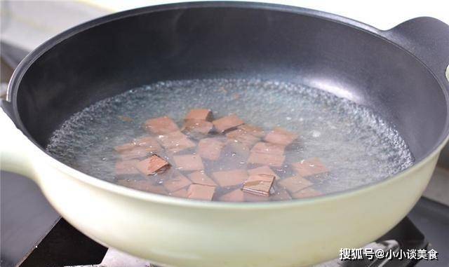 2、新鮮鴨血用清水沖洗幹凈,然後用刀將鴨血切成小塊,鍋中倒入適量清水,大火燒開,將鴨血和豆腐放入鍋中。漂白,然後取出,瀝幹並放在一邊。蔥切蔥花備用,薑去皮切片備用。豆腐焯水後,豆腐豆的腥味可以很好的去除。