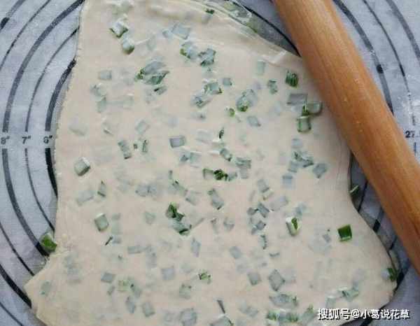 把餃子包攤好,刷上食用油。刷完油後,在上面撒少許鹽。這樣做出來的蔥油餅可以稍微帶點香味,又可以助長油的香氣。然後在上面撒上切碎的蔥。蔥花不管多小,最重要的是要鋪好,讓蔥花在蛋糕裡鋪得均勻、薄。然後按照之前的順序,做餃子皮和蔥花,放在一起,用搟面杖搟一下,煎餅就完成瞭一半!
