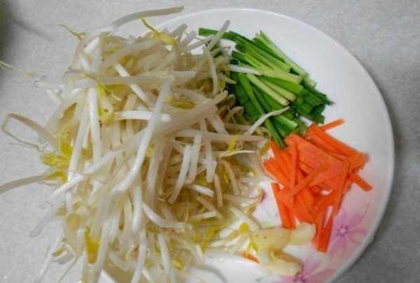首先準備好所需材料:豆芽、蓮藕、油、鹽、醋、胡蘿卜、青椒、大蒜