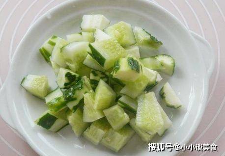 第二步是處理這個過程中的其他成分。黃瓜洗凈後,去皮,切成小方塊。鍋裡放一個雞蛋,提前煮熟。去皮後,將雞蛋切成小方塊。切成小塊放入碗中;