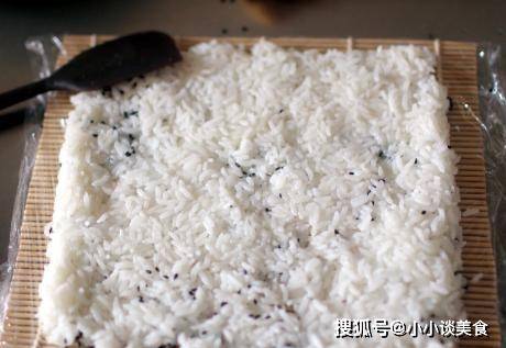 第三步加入切碎的黃瓜丁,一邊準備壽司墊一邊攪拌均勻,鋪上一張保鮮膜,待糯米飯蒸熟後,用勺子盛出。然後放在保鮮膜上;