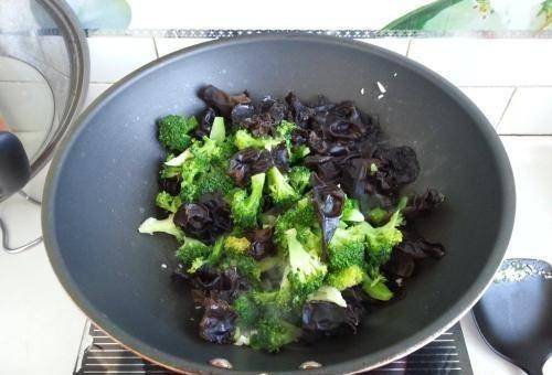 鍋中加入適量的水,大火燒開,加入少許鹽和油,拌勻,將西蘭花放入水中浸泡約一分鐘,然後撈出,洗凈瀝幹。供以後使用。然後放入黑木耳,用水焯一分鐘左右。焯水後及時撈出,沖涼,瀝幹水分備用。