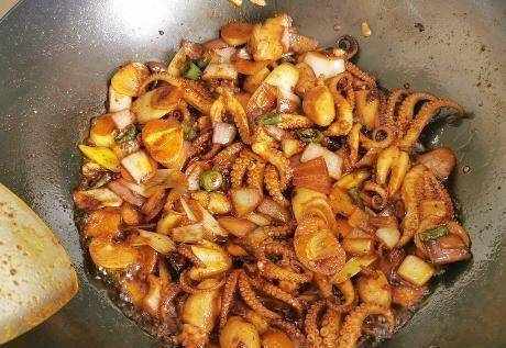 3.等所有材料炒的差不多瞭,加入章魚。章魚不宜炸太久,否則味道會太老。