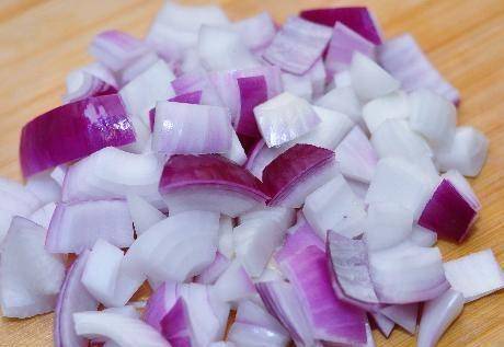 第三步,洋蔥1個,剝去外面的幹皮,切成小塊,薑切片,蒜切塊,辣椒去根切塊,鍋裡加油,放入薑末加熱後切碎的大蒜;