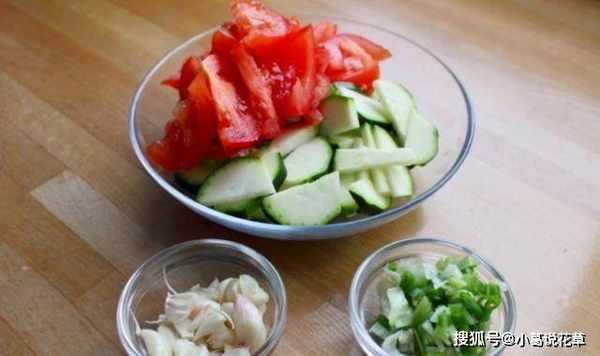 首先準備好必要的材料:西紅柿、西葫蘆、油、鹽、蒜、白糖