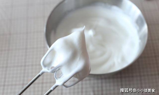 5、蛋白加入檸檬汁,分三次加入細砂糖。每次加糖的狀態是打到大氣泡的狀態,打到大氣泡消失變軟略膨脹的狀態,打到濃稠略有層次感的狀態。最後打發的狀態是一個直立的小鉤子,提起打蛋器就可以拉出來瞭。蛋白質柔軟有光澤。