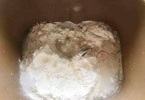 制作過程:第一步,先準備好所有的材料,將面粉放入面包機中,將鹽、白糖、酵母粉分別放入面粉中,同時加入150毫升的水。;
