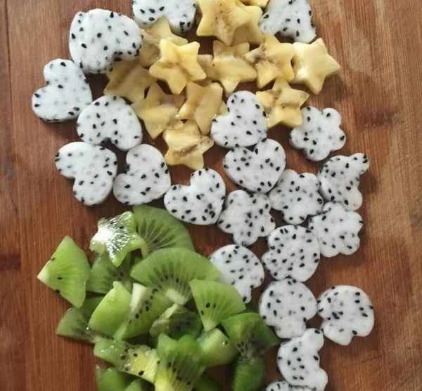第三步:香蕉、火龍果切片,用不銹鋼模具壓成不同形狀,奇異果切塊