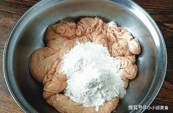 淀粉比較滑。加入淀粉後,豬大腸裡的粘液不會粘手。去除所有粘液後,用溫水沖洗幹凈,然後將豬大腸翻過來,去除裡面的油。全部取出,處理好後,翻過來清洗豬大腸,將清洗幹凈的豬大腸放入盆中,加入適量的水和優質白酒,浸泡半分鐘。小時。豬大腸內無腥味。