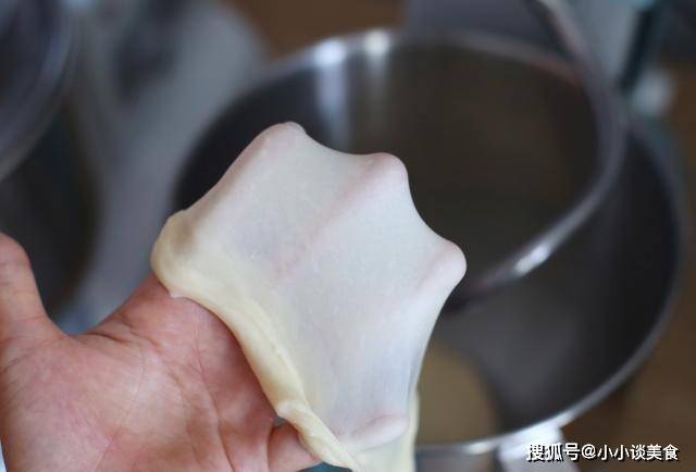 2、繼續揉至可以拉出透明膜,即展開階段。作為一個普通的小面包,這部電影不需要太多的追逐