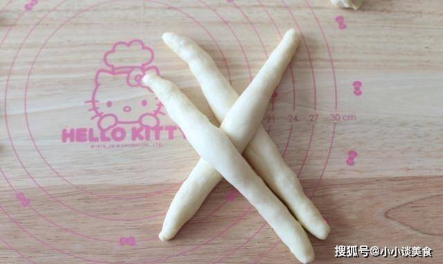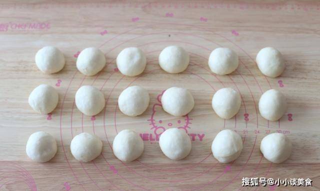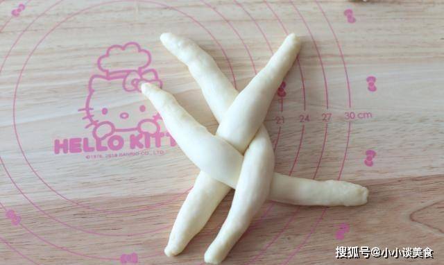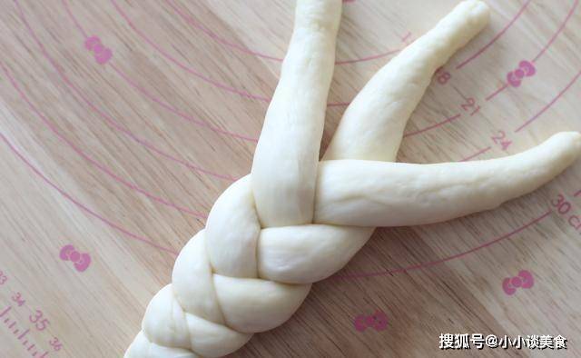 4、取出發酵好的面團,輕輕晾幹。將面團均勻分成18份,每份約26克。編3條辮子,可以編6條辮子。滾圓後蓋上保鮮膜靜置8分鐘