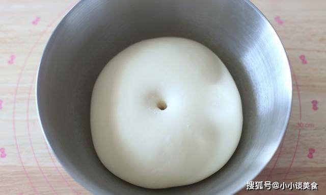 3、面團蓋上保鮮膜,室溫發酵2.5次左右。當你用手蘸上幹粉,捏小孔,不塌陷,不回彈,就說明第一次發酵完成。