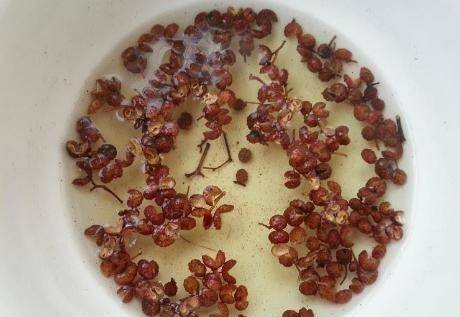 第一步,將花椒粒放入碗中,加適量溫水泡發,蔥薑切末,豬肉切末放入肉餡中,放入碗中,加入蔥末、薑末,拌勻浸泡好的花椒水倒入少許;