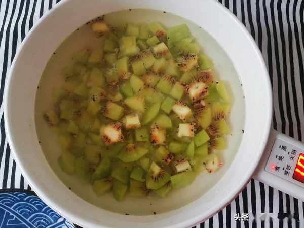 鍋裏放入少許清水燒開,倒入奇異果一燙,就可以關火了,這樣奇異果就會變軟。