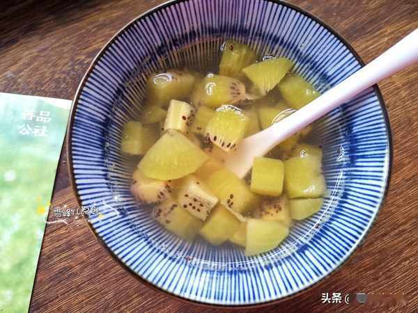 捏起來比較硬,但是去掉皮發現已經熟了,能直接吃,甜味也足,汁水多多,孩子吃還是忍不住給她做了糖水。要做糖水先把紅心奇異果用刀子去掉外皮,切成小丁。切開紅心奇異果我們可以清楚地看到紅心,紅心奇異果之所以果肉是紅心,是因為它含有豐富的花青素。花青素是一種强抗氧化劑,其抗氧化能力是胡蘿蔔素的10倍以上,比維他命E高出50倍,它能清除人體自由基,延緩衰老,還可以防止紫外線破壞肌膚產生皺紋。不但孩子吃得好,女生更是一定不要錯過紅心奇異果哦。