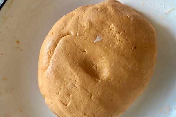 1、胡蘿卜的水分和面粉吸水性不同,根據面團幹濕增加粉量,揉好的面團是光滑不黏手的狀態。