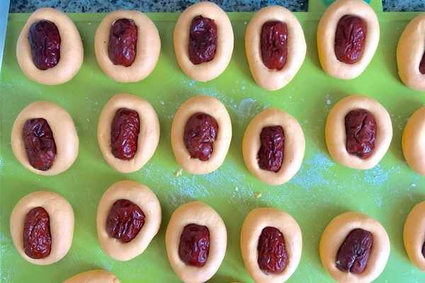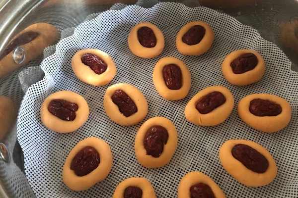 7、取一個小面團搓成光滑的圓球,放上紅棗壓扁,將全部的軟糕做好。