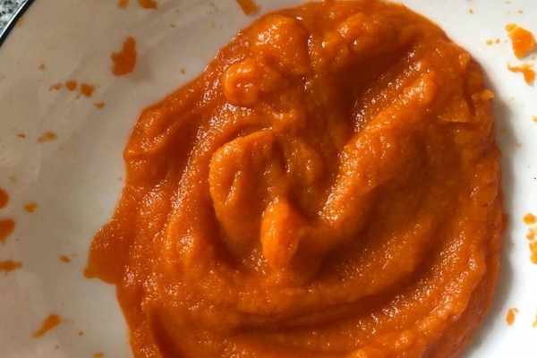 2、蒸好後的胡蘿卜取出來,趁熱將胡蘿卜壓成泥,要是傢裡又料理機的話就直接放入料理機中,攪拌一分鐘就形成細膩的胡蘿卜泥瞭。