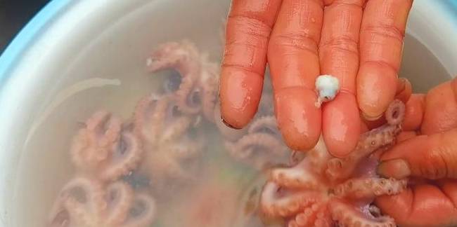 八爪魚的八隻腳中間長著八爪魚的嘴,裡面的牙齒我們兩隻手輕輕一擠就出來瞭,八爪魚的牙齒有很多臟東西,致癌物,吃瞭對身體不好,清洗的時候一定不要忘記這一步。八爪魚一煮就老,很多人做不好,海邊人教你正確的方法,鮮嫩又脆爽!
