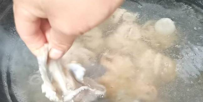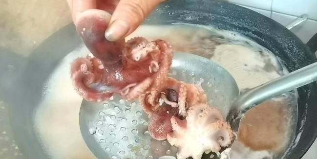 搓洗出黏液的八爪魚,我們用流動水清洗幹凈,這時候我們開始煮八爪魚瞭,那麼煮八爪魚要開水下鍋還是涼水下鍋呢?鍋中水燒開放進八爪魚,加料酒,醋,鹽,薑絲,大火燒開,煮3~5分鐘,時間不要太長,太長八爪魚就老瞭,吃著像橡皮筋一樣咬不動,如果時間太短,八爪魚腥氣太大,吃著一點也不香。用手捏一捏八爪魚的肚子,變得有彈性,否則一捏就脫皮,這時候八爪魚就熟瞭。水開下鍋的目的,為瞭讓八爪魚外皮快速定型,顏色紅潤鮮亮,不容易脫皮。鹽有凝結蛋白的作用,也能使八爪魚快速定型,顏色光鮮亮麗,八爪魚這樣煮,保證鮮嫩脆爽,越吃越香