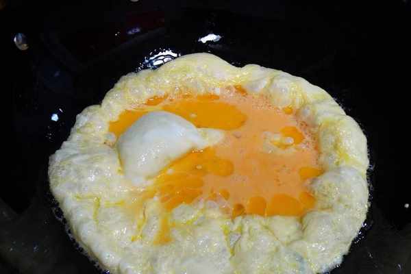 4、打幾個雞蛋在碗裡,加上少許食鹽,將其攪散備用。鍋內燒熱油,把雞蛋倒進去,不停翻炒,把雞蛋炒熟以後,先盛出來備用。