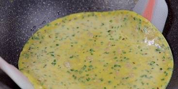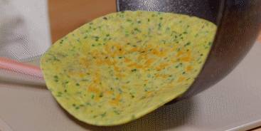 小火,煎到底部定型之後翻面。這個餅是整張攤出來的,會有些大。如果對自己翻面不是很放心的姐妹,可以用個小盤子,把餅從鍋中倒入盤子內,然後翻面倒回去。如果是比較成熟的老手的話,就可以用兩個矽膠鏟直接輔助翻面瞭。