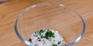 肉末盛出晾涼。加入低筋粉、香菇和油菜。低筋粉的蛋白質含量低,這樣做出來的小餅口感更加松軟。如果傢裡沒有,也可以換成常用的普通面粉。