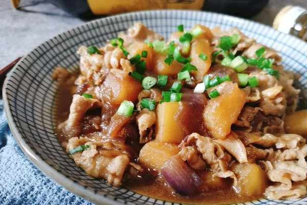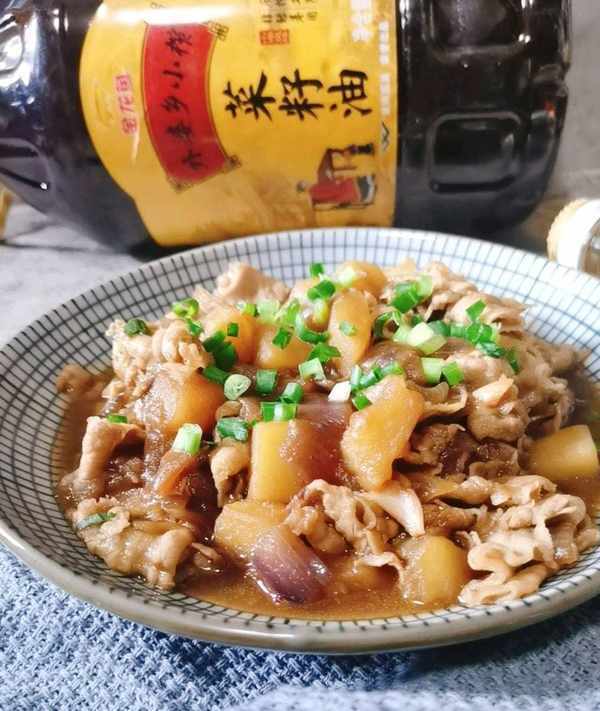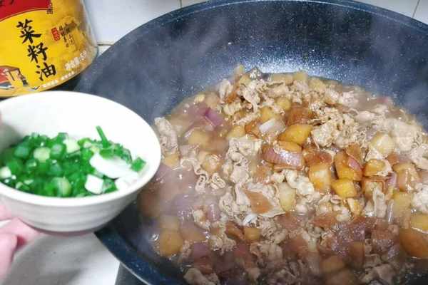 【烹飪食材】:肥牛卷350克、土豆一個、洋蔥一個、生抽2勺、蠔油一勺、料酒一勺、白糖適量、清水適量、蔥花適量