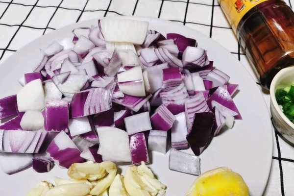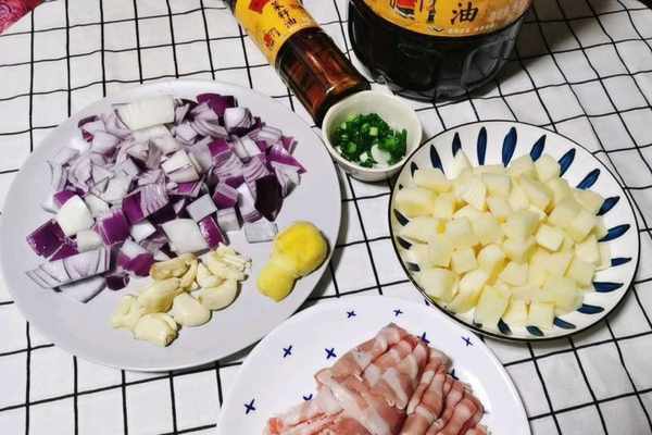 1、準備好這道菜要用的所有食材,將肥牛卷還有洋蔥和土豆處理好備用,洋蔥切成小塊,土豆去皮之後也同樣切成小塊。