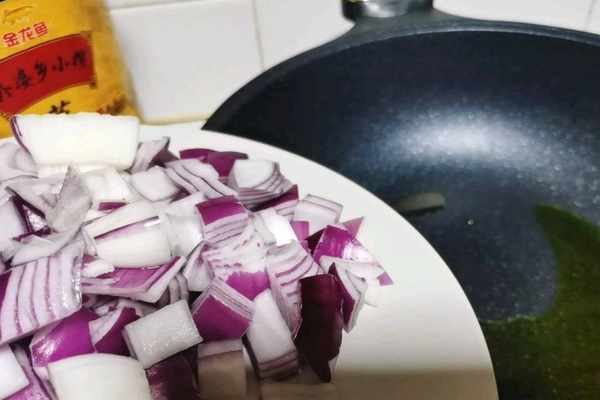 6、鍋中加入適量的食用油燒熱,然後放入洋蔥、蒜頭炒出香味。