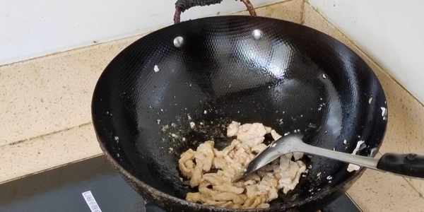 等到肉絲醃制好瞭之後,我們把鍋燒熱,倒入一些食用油,把醃制好的瘦肉倒入油鍋裡面,稍微翻炒一會。肉絲炒至變色之後,我們就可以在裡面倒入少量的生抽,翻炒一會,倒入生抽可以使肉絲更加入味,大概炒個半分鐘左右,就可以把肉絲撈出來備用。