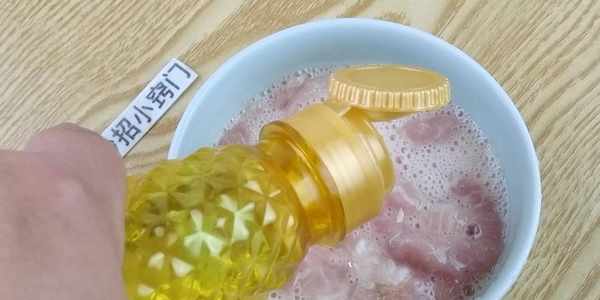 然後我們在裡面倒入大概50毫升的食用油,抓拌一會,醃制個半個小時左右。倒入少量的食用油,能夠使肉絲不會粘連在一起,這樣我們在炒瘦肉的時候,就不會出現粘連的情況。