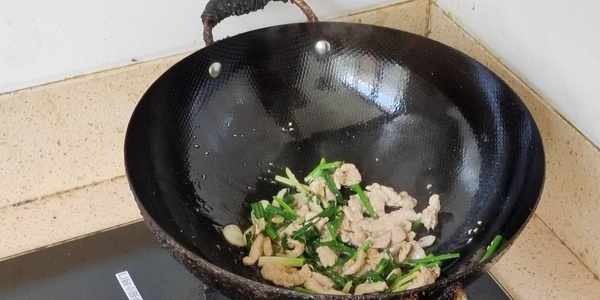 接著洗鍋,開小火,在鍋裡倒入少量的食用油,然後在鍋裡倒入一些大蒜片,生薑絲,小蔥段,翻炒一會,炒出裡面的香味。等到蔥薑蒜的香味全部都激發出來的時候,我們把肉絲倒入鍋裡,翻炒一會,大概炒個兩分鐘左右就可以瞭。