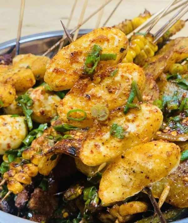 樂山燒烤裡的美味,一定要一口氣報完,不帶任何標點:黃喉牛肉鴨腸五花肉鴨舌雞尖羊肉排骨土豆四季豆豆腐幹。一個貫口表演下來,口水就關不住瞭。
