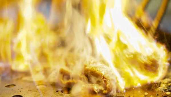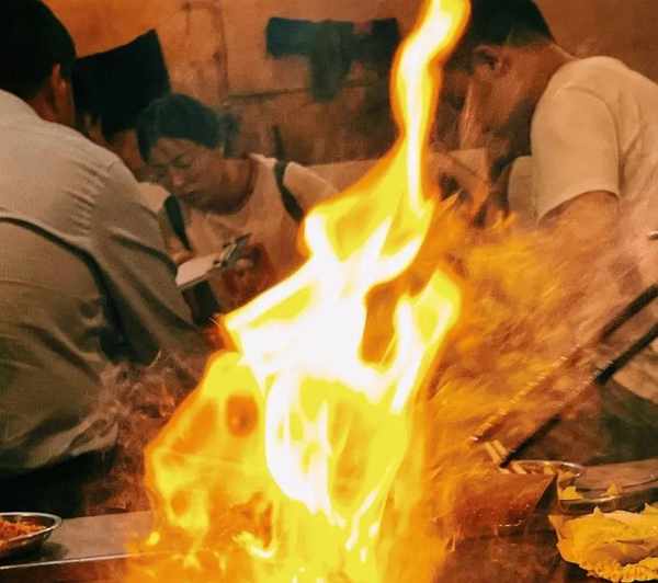 前者是以鐵板為烤器,把碼瞭味的菜倒在鐵板上,用鐵鏟不斷翻炒。鐵板是當地獨有的鐵板,中間呈蜂窩狀。油一多,火就猛,所以對火候的把控要求非常高。