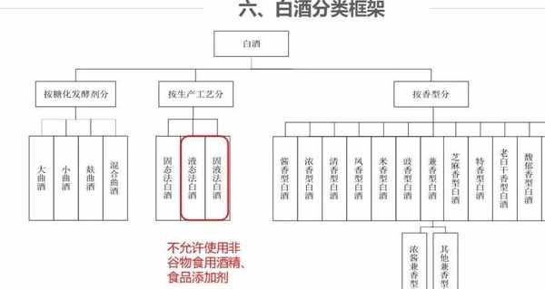 其實我們的白酒一直分為這三個工藝方式,但是固液法白酒和液態法白酒,它就不允許再使用非谷物來源的食用酒精和食品添加劑(比如廢棄糖料,薯類農作物發酵蒸餾出來的酒精),這點是最大的一個區別。其實固態法一直是都是不允許使用的,(以後)這三類,統統都不允許再使用食品添加劑。