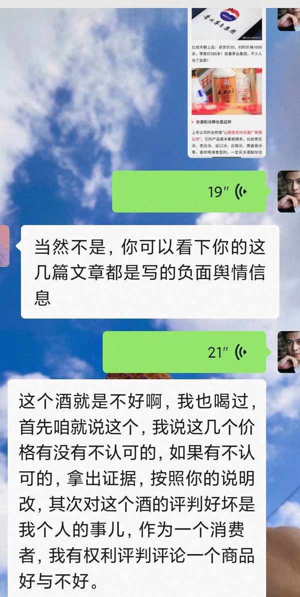 而且我所說的都是實話,根本涉及不到惡意抹黑它的掃碼價格,零售價格。都可以調查出來,但是和我商討的是一名打工人員,跟大傢一樣的打工者,所以為瞭不為難他,我隻好把其中一個字替換瞭某朝上品,我相信大傢都應該知道是什麼酒。