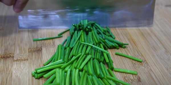 2.把韭菜也洗幹凈,根部太老瞭,我們可以切掉一點,然後把它成小段