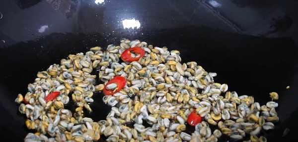 4.起鍋燒油,鍋燒熱後,倒入一點油,蒜頭爆香,辣椒切炒香,再倒入薄殼米,翻炒均勻,但是薄殼米不能炒太久