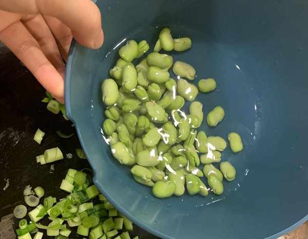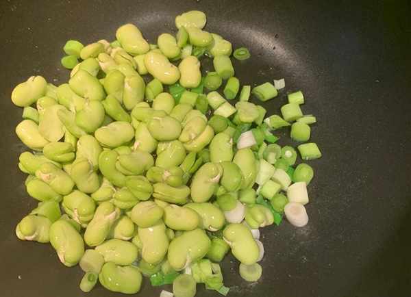 3.鍋裡倒入油,放入蠶豆和蔥花,炒香蠶豆